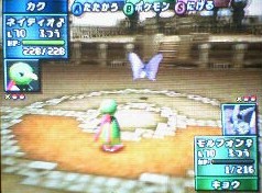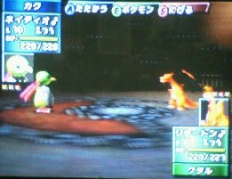 対カリン戦でも色々面白い事あったのに写真取れなかったー!! エレキッド大活躍だったのに取れなかったー!! まず、エレキッド♂VSブラッキー♀。 エレキッドが雷放ってブラッキーの体力を3分の1削る。 そしてブラッキーの怪しい光→エレキッド混乱で自分を攻撃。 ブラッキーのメロメロ→ああぁぁぁぁぁ!!エレキッドオォォォォォ!! でも、混乱でメロメロでよろよろな状態にも関わらず攻撃。 それが2度も続いてブラッキー倒せました。 エレキッドが倒された後もそんな感じで事が進む。 …皆、異性だからって容赦しないぜ!!って子ばっかりだ。 でも、そんな皆が大好きだー!!